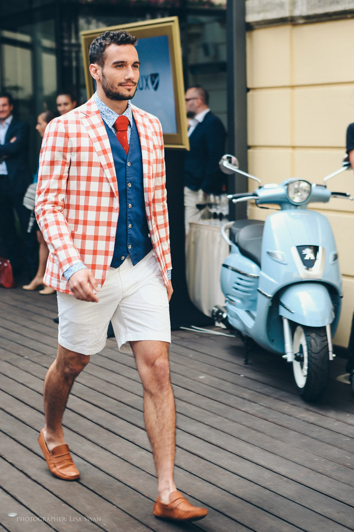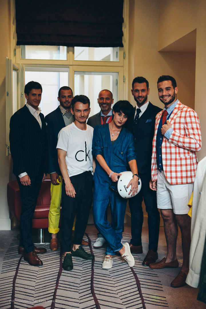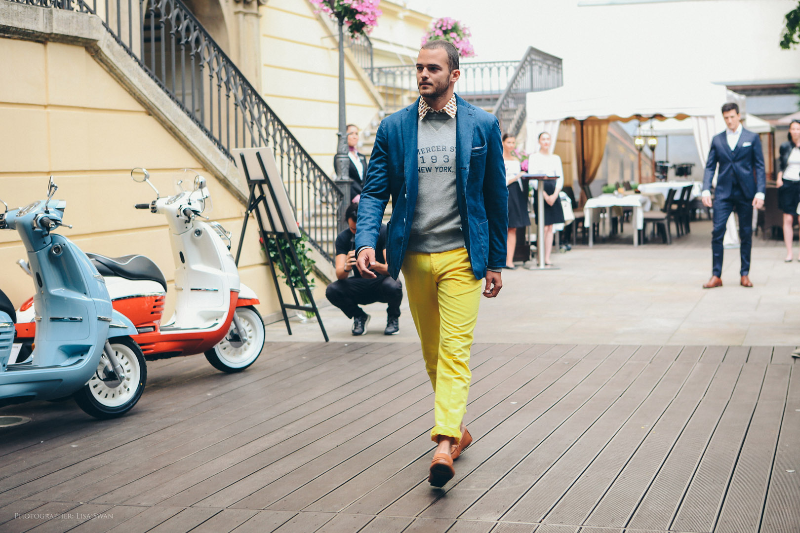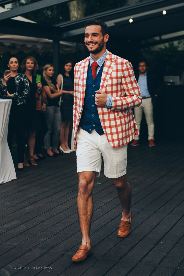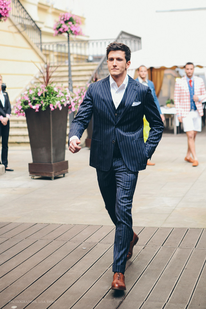 Modelové si to opravdu užívali, o čemž svědčí hlavně tato fotka, kde si dovolili přehlídku obohatit i o jednoduché taneční kousky. Následovala vzorová ukázka poloformálního oblečení na léto a také francouzský um pro elegantní soulad barev. Saka se vzorem windowpane, neboli okenní tabule, jsou v módě a o nositeli tak vyzvídají, že má pro módu velmi dobrý vkus. Opět bez takovýchto bot, v tomto případě přímo mokasín, by to ani nešlo … má štěstí že v nich nemá ponožky! 😀
