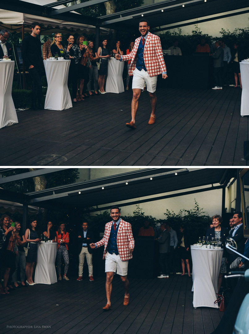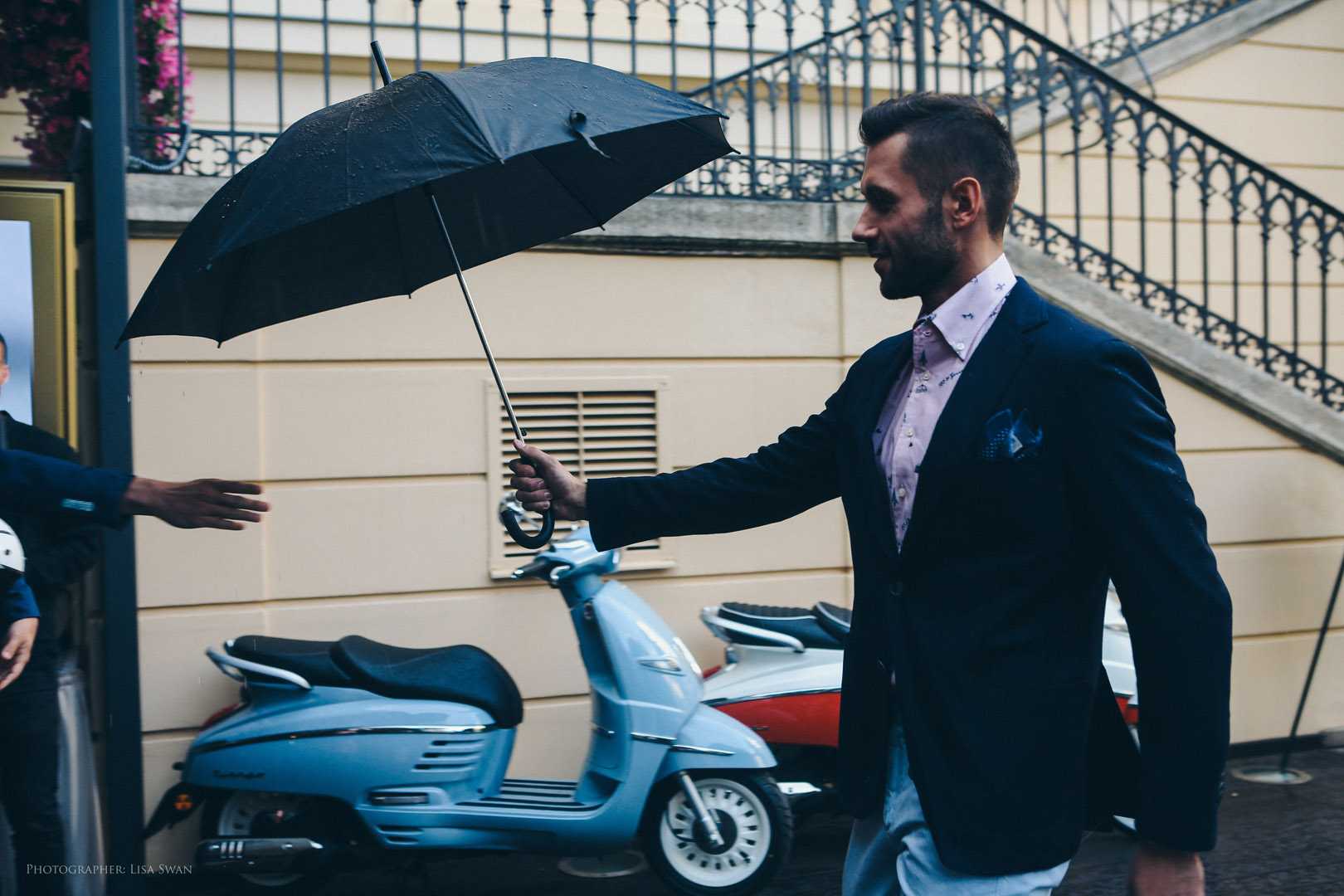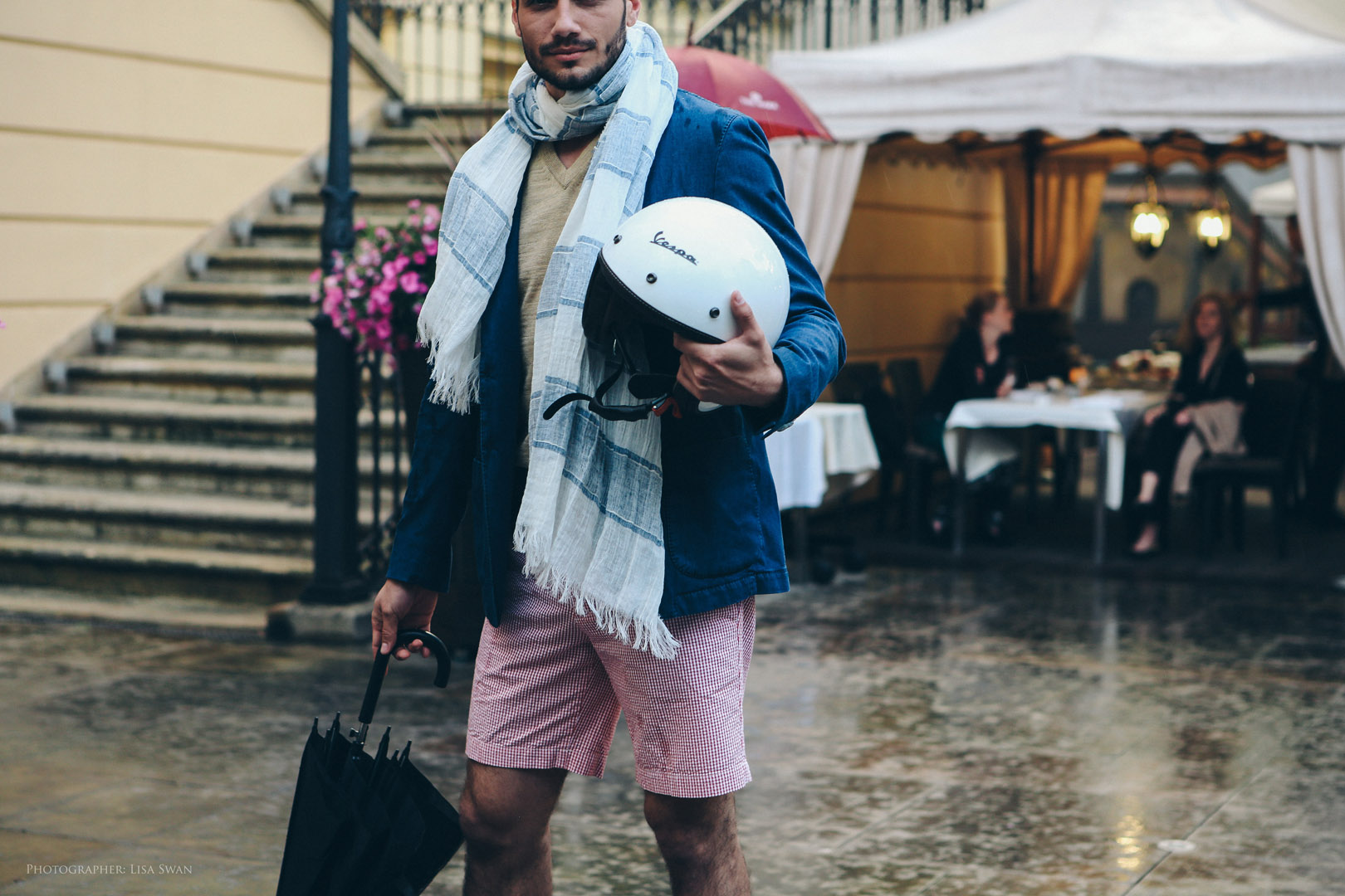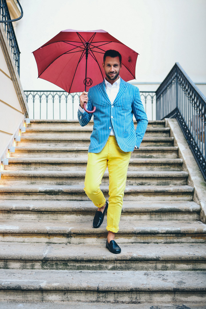 Modelové si to opravdu užívali, o čemž svědčí hlavně tato fotka, kde si dovolili přehlídku obohatit i o jednoduché taneční kousky. Následovala vzorová ukázka poloformálního oblečení na léto a také francouzský um pro elegantní soulad barev. Saka se vzorem windowpane, neboli okenní tabule, jsou v módě a o nositeli tak vyzvídají, že má pro módu velmi dobrý vkus. Opět bez takovýchto bot, v tomto případě přímo mokasín, by to ani nešlo … má štěstí že v nich nemá ponožky! 😀